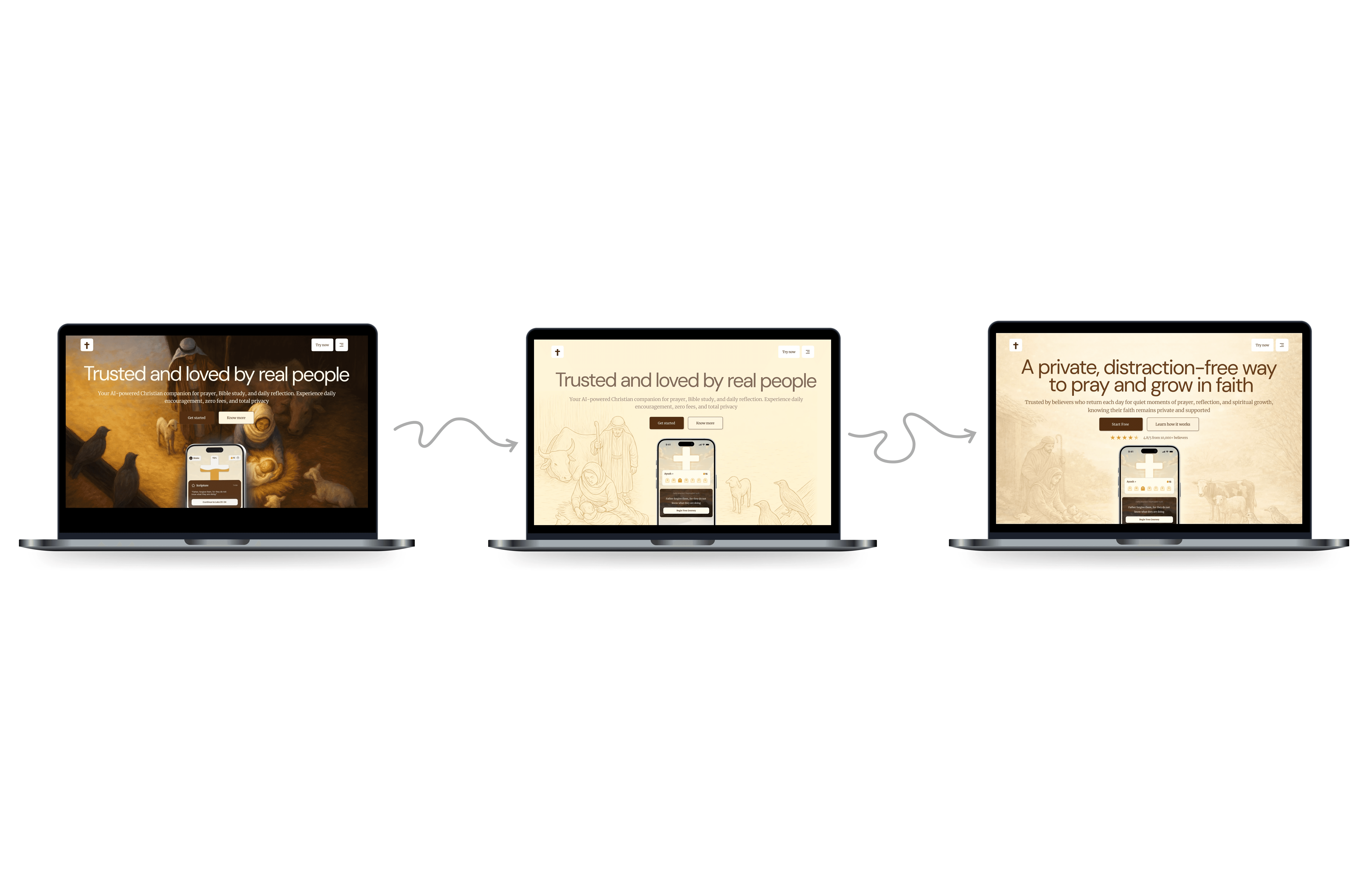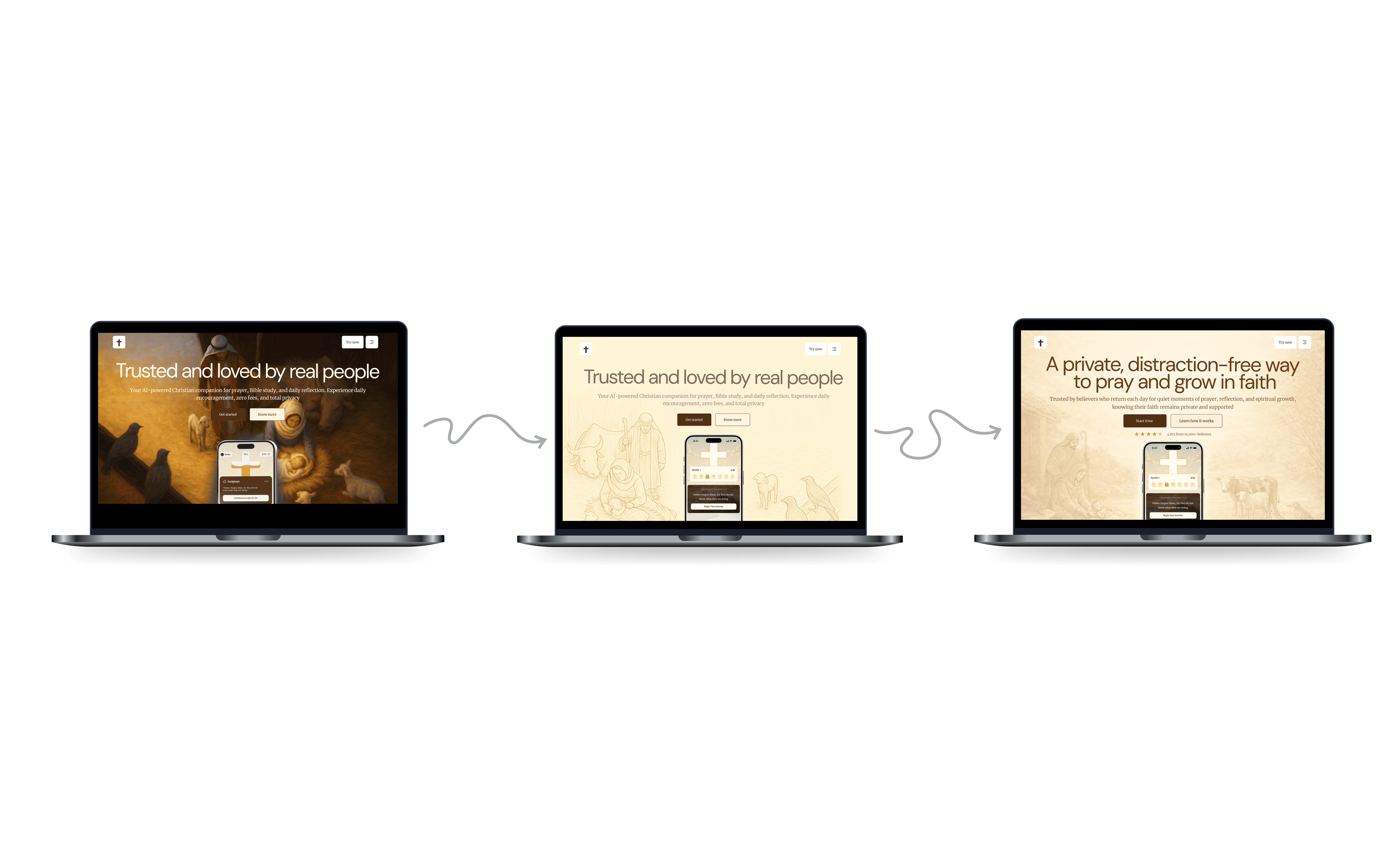 We explored multiple visual directions but chose simplicity over tech heavy aesthetics. Faith seekers need calm, so we prioritized clean design, warm visuals, and clear messaging that felt welcoming rather than overwhelming