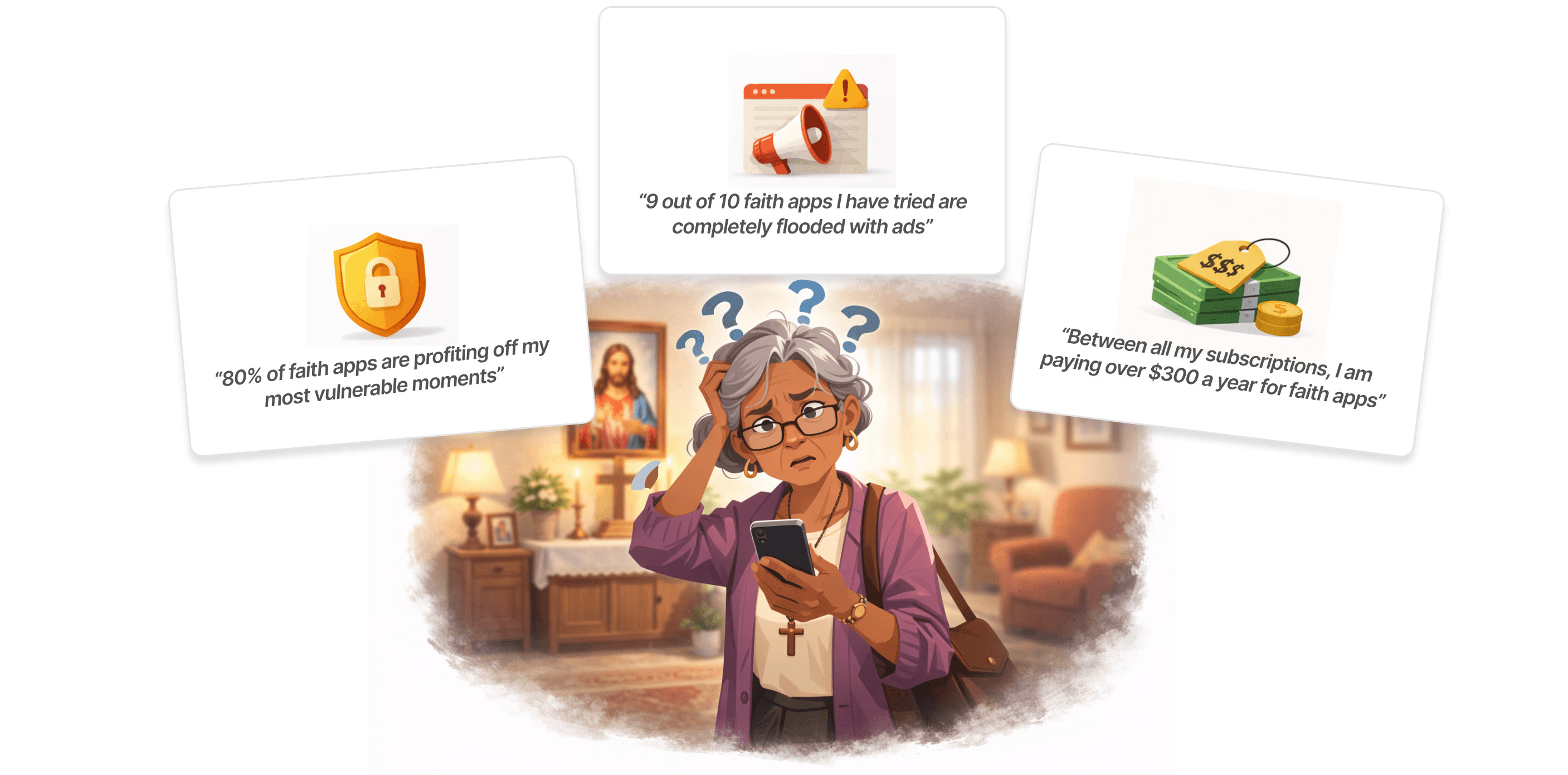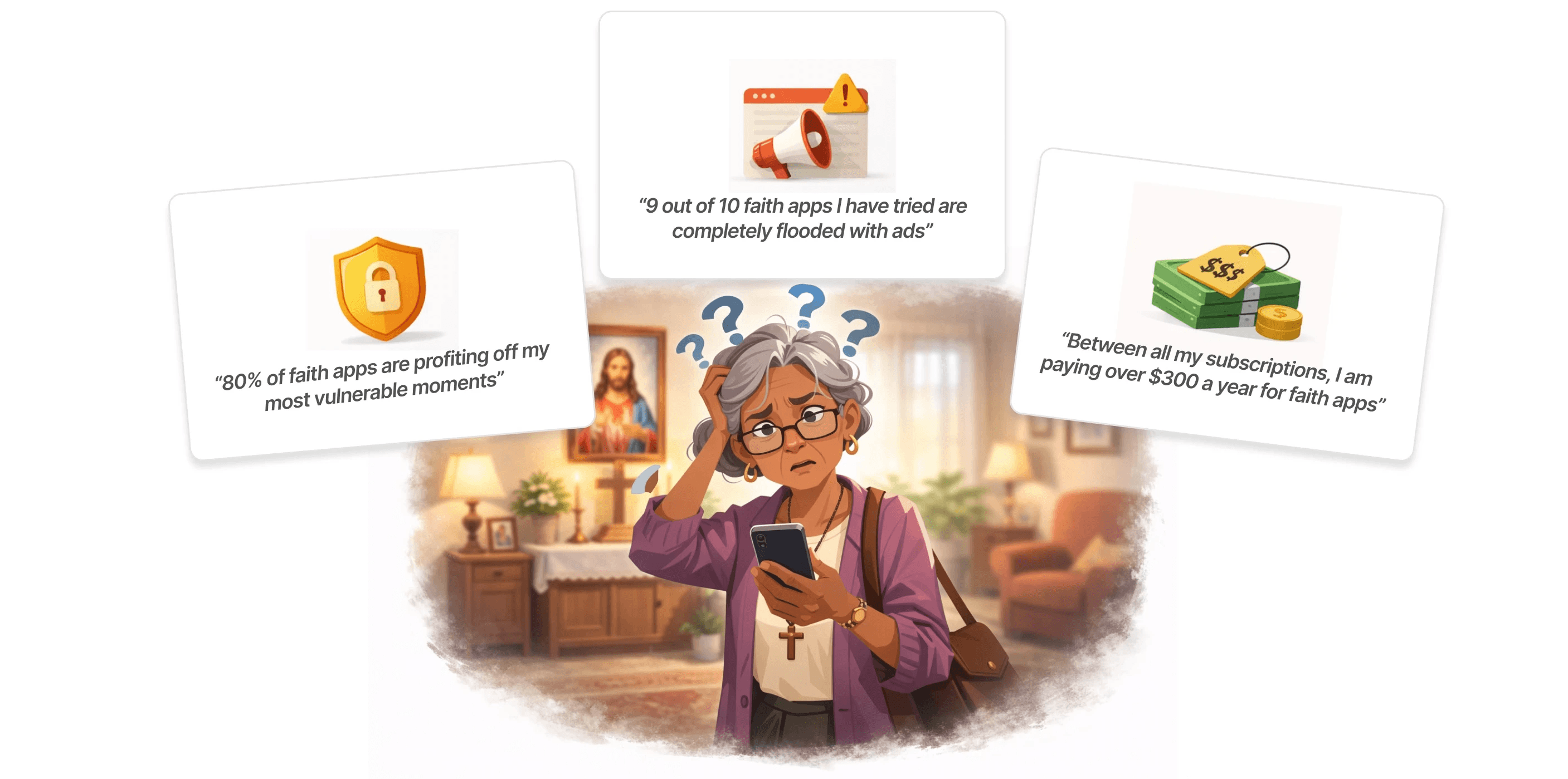 Most faith apps compromise privacy, force intrusive ads, and charge high costs, eroding trust in spiritual practice.