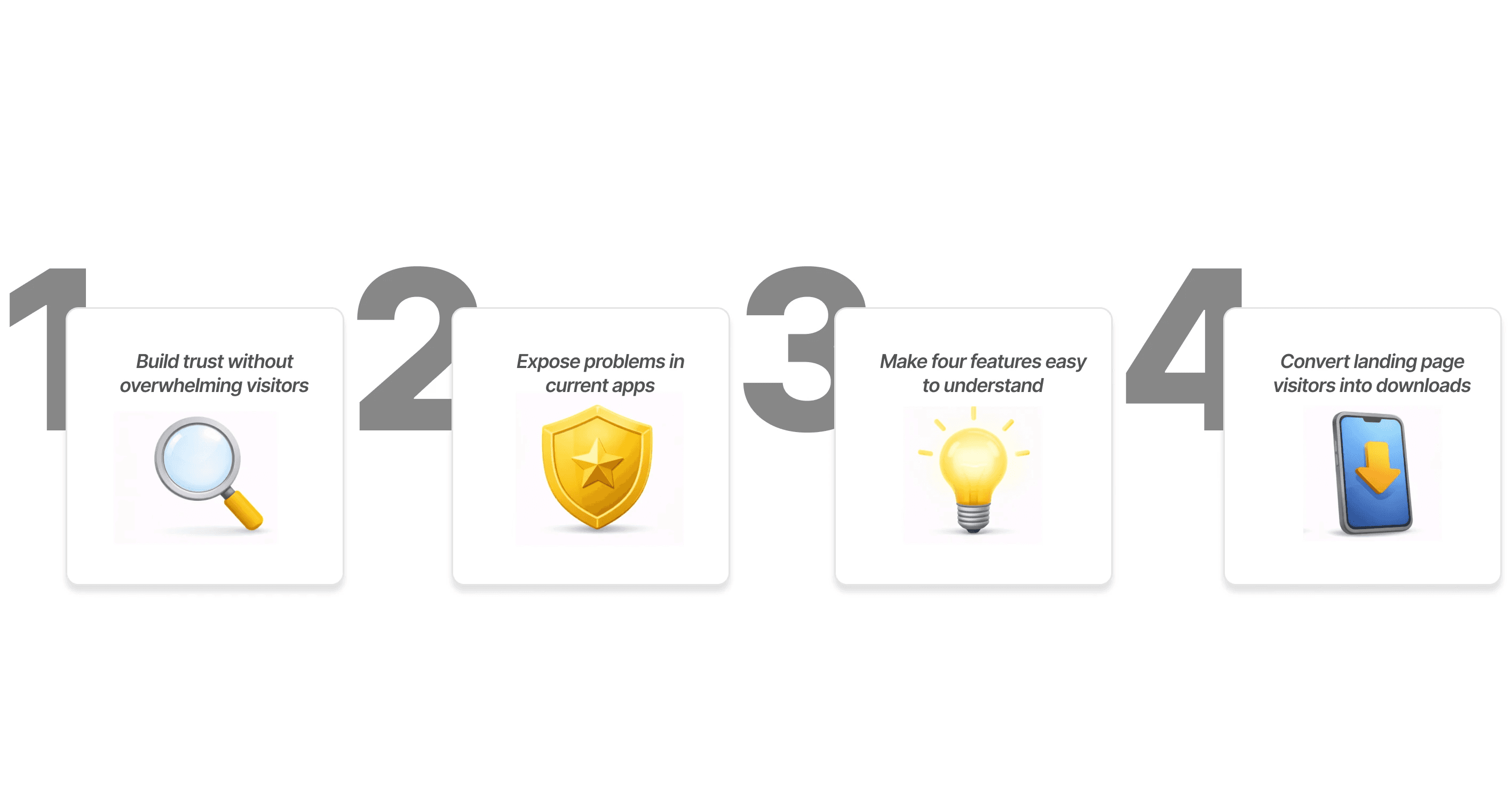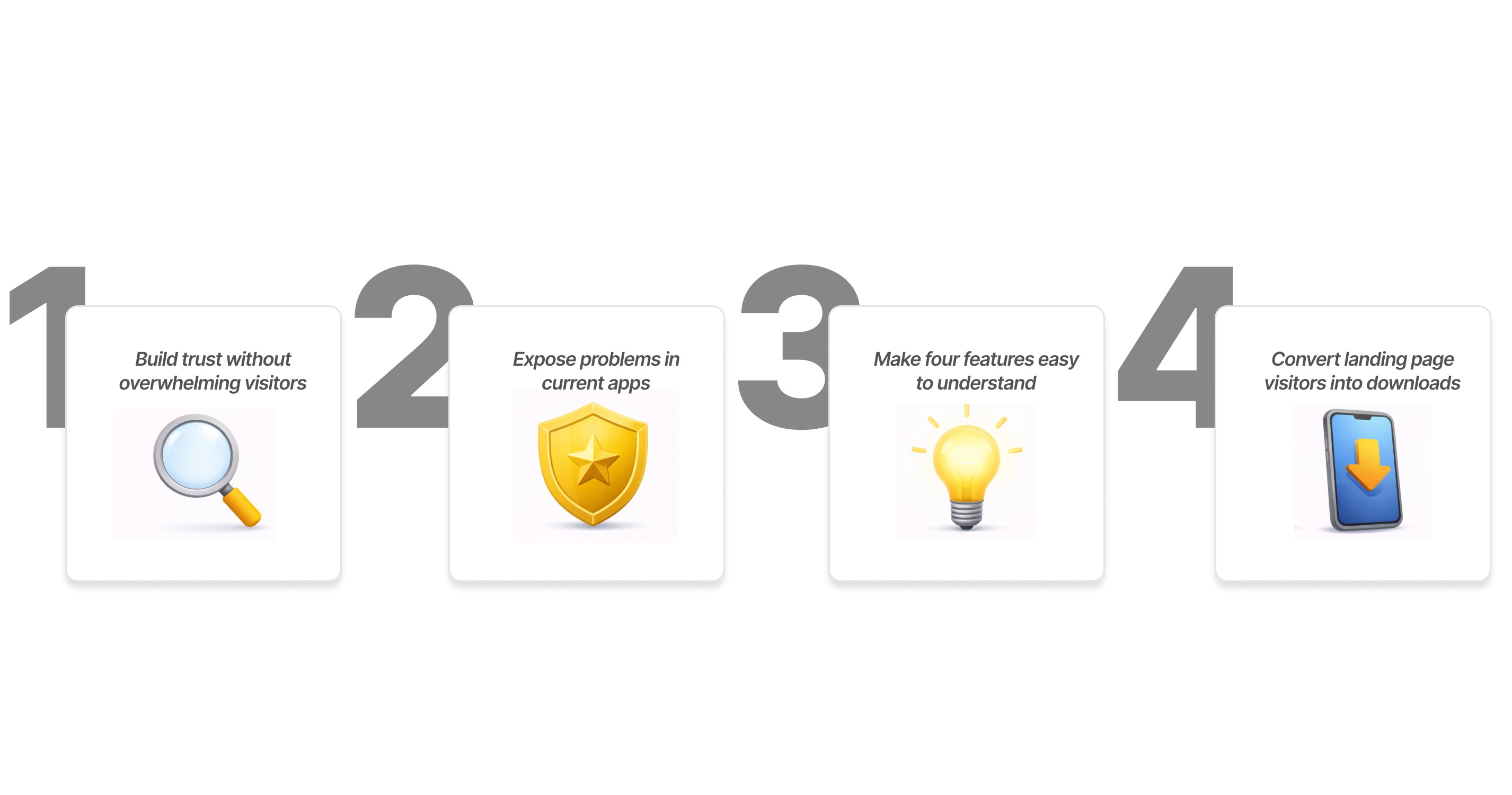 Current faith apps compromise privacy and overwhelm users, while landing pages fail to build trust. The challenge is to design a credible landing page highlighting four features and driving downloads in thirty days.